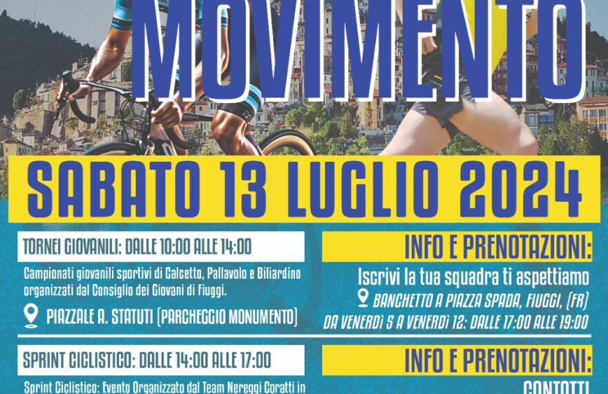 “Fiuggi in Movimento” è la grande manifestazione sportiva interamente organizzata dal nuovo Consiglio dei Giovani, che si terrà nella città termale sabato 13 luglio.Un evento che vedrà impegnati i partecipanti per un’intera giornata: si inizia con i tornei giovanili (dalle ore 10 alle 14) con i campionati sportivi di calcetto, pallavolo e biliardino