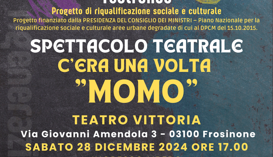 Il Teatro Vittoria di Frosinone si prepara ad ospitare uno speciale evento teatrale, frutto di un importante progetto di riqualificazione sociale e culturale. Sabato 28 dicembre 2024 alle ore 17:00, andrà in scena “C’era una volta Momo”, uno spettacolo ad ingresso libero che rappresenta il culmine del laboratorio teatrale “Teatrando”.