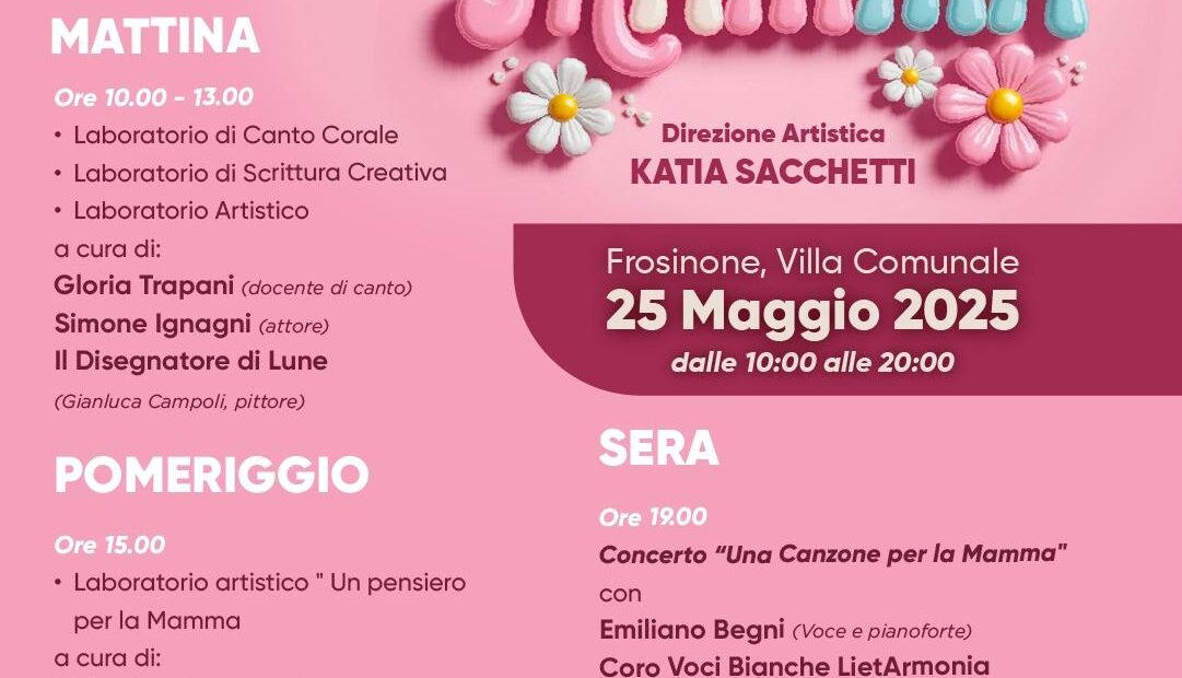 Dalle 10 alle 13, spazio ai laboratori di canto corale, di scrittura creativa e artistico a cura di Gloria Trapani (docente di canto), Simone Ignagni (attore) e Il disegnatore di lune (Gianluca Campoli, pittore). Alle 15 partirà il laboratorio artistico “Un pensiero per la mamma” a cura di Valentina Cerquozzi e Martina Bocconi. Alle 17.30 spazio alla coreografia delle official Cheerleader Frosinone&Ceccano con “Mamme Cheers” a cura di Cristina Bartolini. Alle 19 si terrà invece il concerto “Una canzone per la mamma” con Emiliano Begni (voce e pianoforte) e il coro voci bianche LietArmonia, con la partecipazione straordinaria di Gloria Trapani, coro “Mom sings”. La partecipazione ai laboratori e agli eventi è gratuita. Presenta Angelo Sarra.