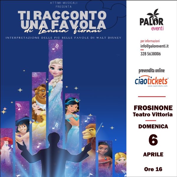 Tutta la magia del mondo Disney sbarcherà a Frosinone al Teatro comunale Vittoria domenica 6 aprile alle 16 con lo spettacolo musicale “Ti racconto una favola” di Lavinia Fiorani, organizzato da Palor eventi con il patrocinio del Comune di Frosinone (assessorati alla Cultura, di Simona Geralico, e al Centro storico, di Rossella Testa). Sul palco, i personaggi amati da generazioni diverse si incontreranno andando oltre le barriere del tempo e dello spazio. La Sirenetta, la principessa Belle, Olaf, Elsa, Rapunzel e molti altri iconici personaggi Disney saranno i protagonisti di una storia che unirà le trame di più mondi fantastici. Attraverso dialoghi incantevoli e canzoni indimenticabili, i personaggi Disney racconteranno le loro avventure, condividendo momenti salienti delle loro vite e delle sfide affrontate, unendo le lezioni di coraggio, amicizia e amore imparati nel proprio mondo. I piccoli spettatori saranno trasportati in un’atmosfera di meraviglia e gioia: l’interazione giocosa e commovente tra i personaggi susciterà risate, sorrisi e lacrime di gioia, creando un’esperienza emozionante e coinvolgente per tutta la famiglia.